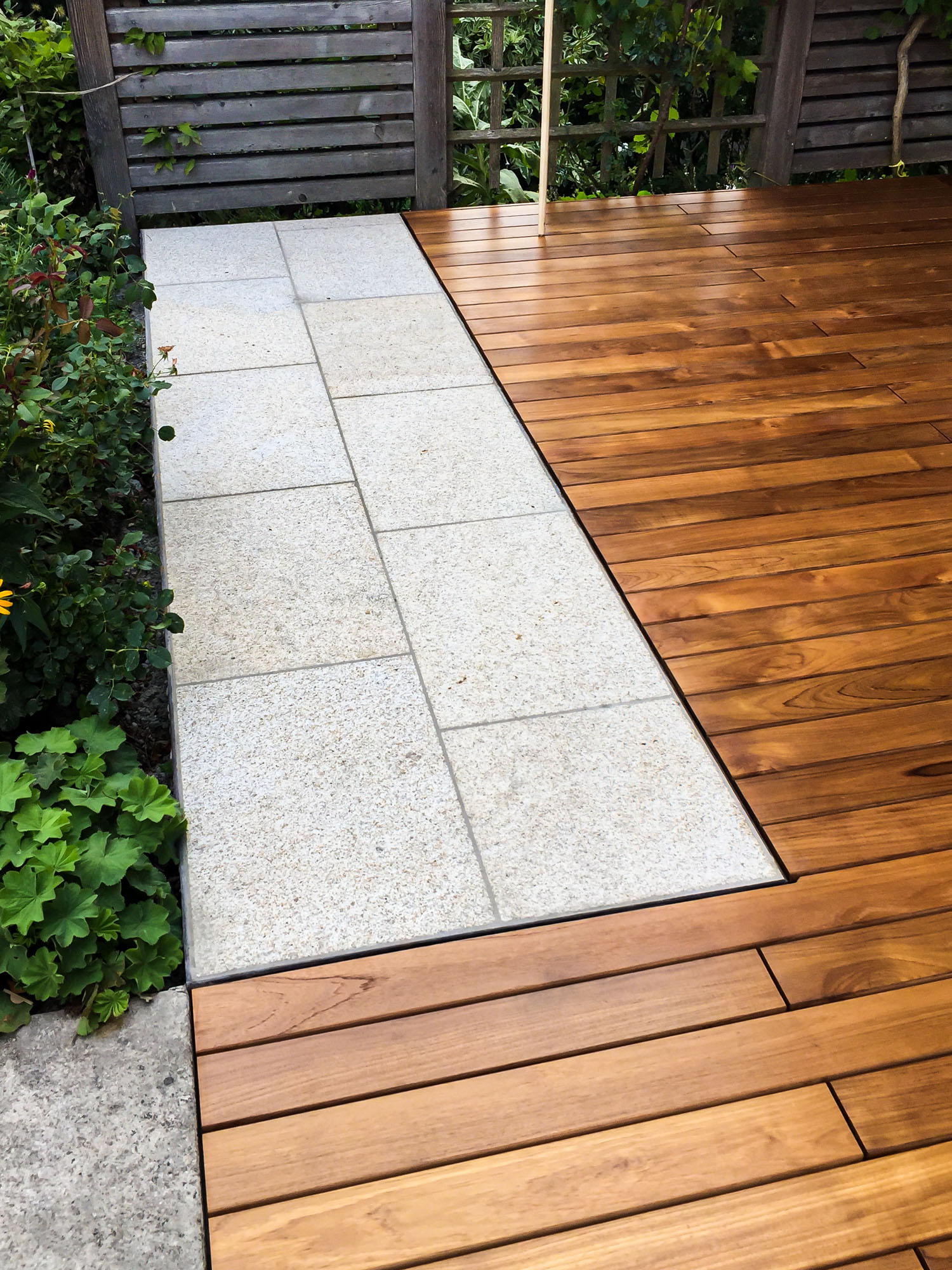 Wir haben eine wunderschöne Terrasse mit Teakholzbelag und Randsteinen sowie Stufen aus Naturstein gebaut. Das Teakholz verleiht der Terrasse einen eleganten und natürlichen Look, während die Randsteine und Stufen aus Naturstein das Design perfekt abrunden. Die Terrasse bietet einen einladenden Platz im Freien, um die Sonne zu genießen oder gesellige Momente mit Familie und Freunden zu verbringen. Mit diesem Projekt haben wir einen stilvollen und funktionalen Außenbereich geschaffen, der lange Freude bereitet.